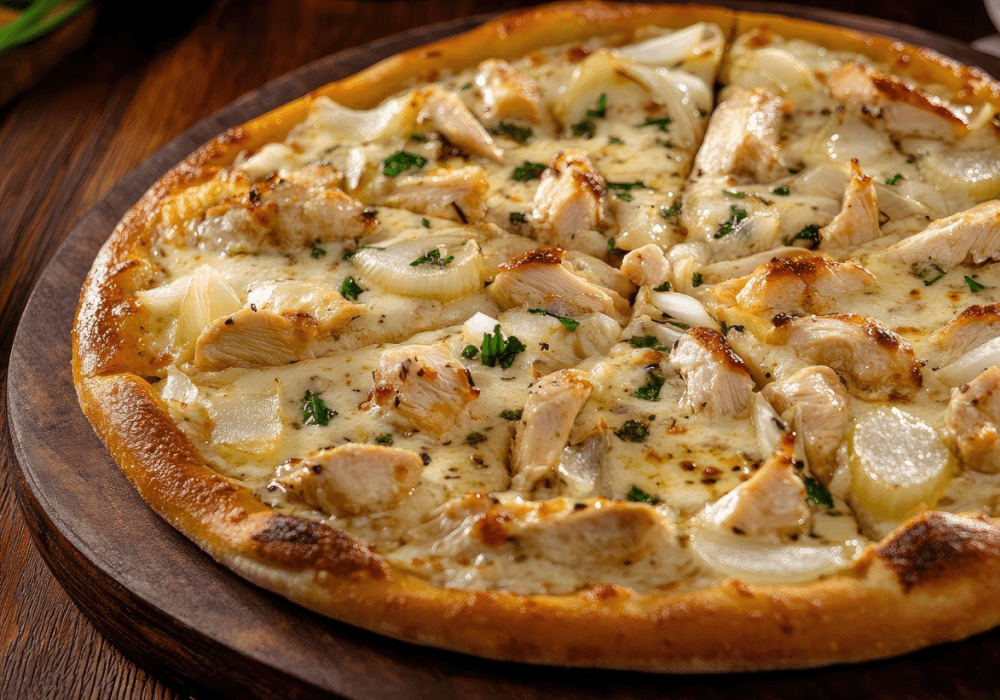 Barbekü sos, marine edilmiş tavuk parçaları, kırmızı soğan, mısır ve mozzarella peyniri.
