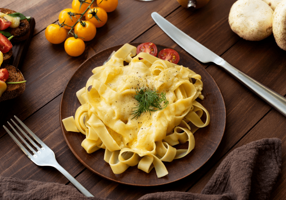 Taze domateslerden, kaşar peyniri rendesiyle.