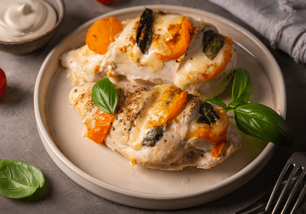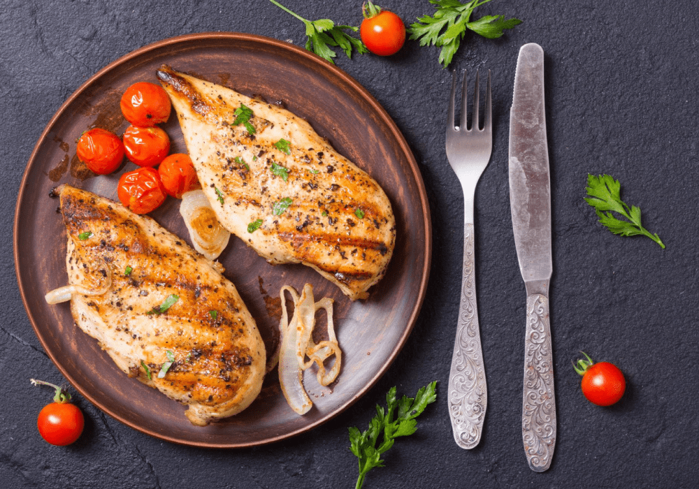 Marine edilmiş tavuk parçaları, közlenmiş biber ve domatesle.