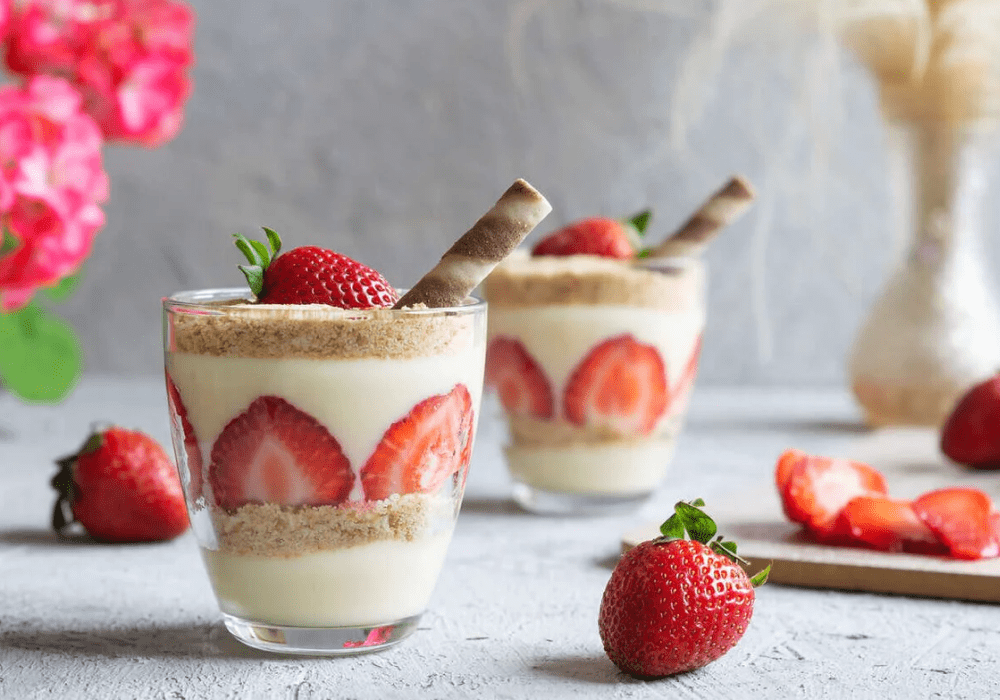 Muz, çilek (mevsimine göre) ve bisküvi katmanlarıyla hazırlanan, kaşık kaşık mutluluk.
